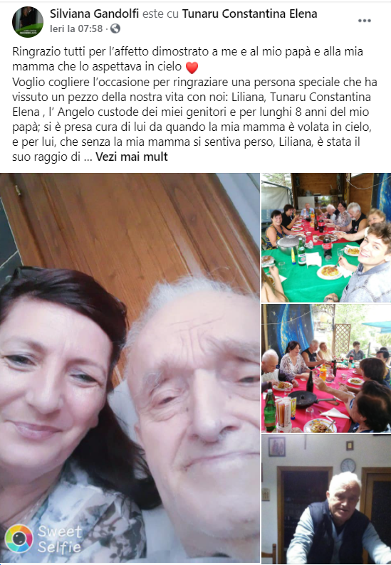Când bătrânul pentru care lucra, în localitatea Lamporecchio, din Toscana, a decedat, fiica pensionarului italian i-a dedicat Lilianei o postare de mulțumire pe Facebook, în care a numit-o „îngerul păzitor al părinților mei” și „raza de soare a tatălui meu”. Elena Constantina Tunaru – Liliana cum îi zic cunoscuții – a început să lucreze la această familie cu mai bine de 8 ani înainte de decesul bătrânului.